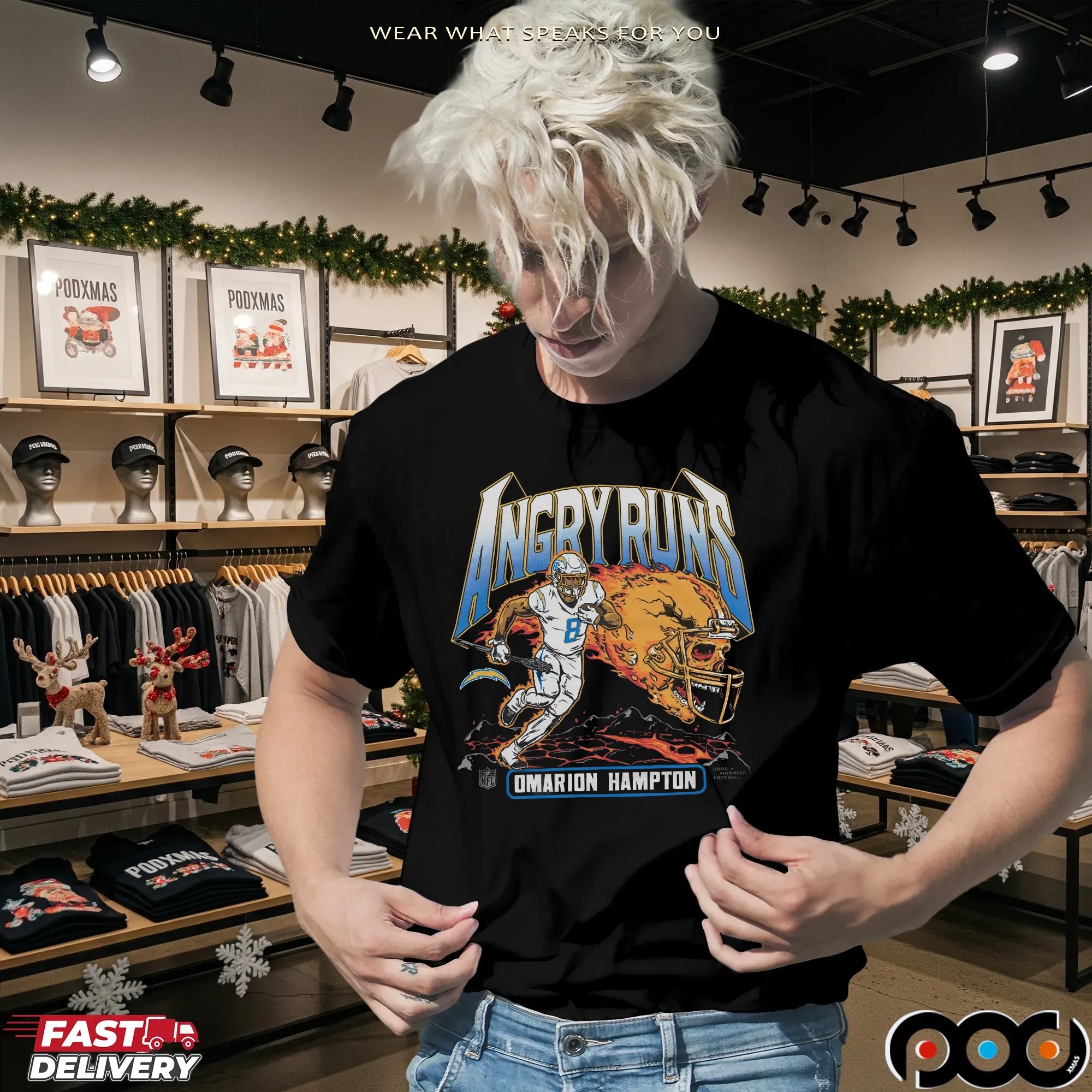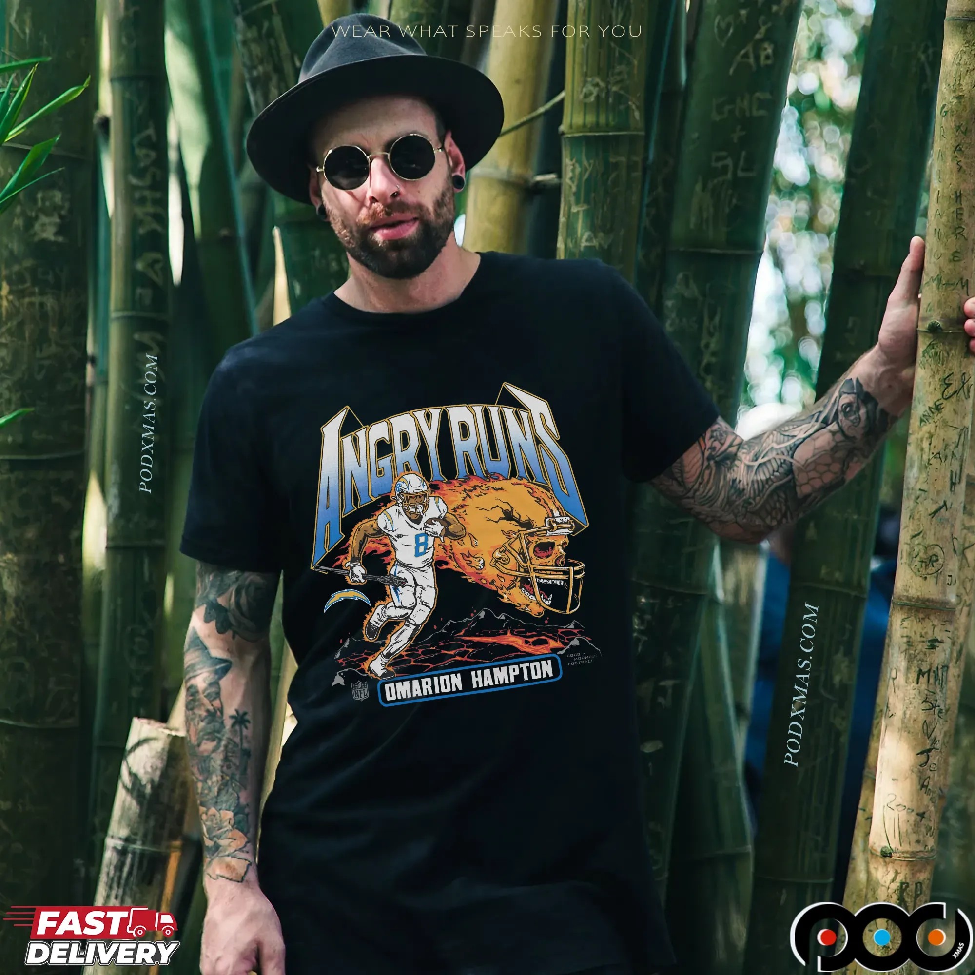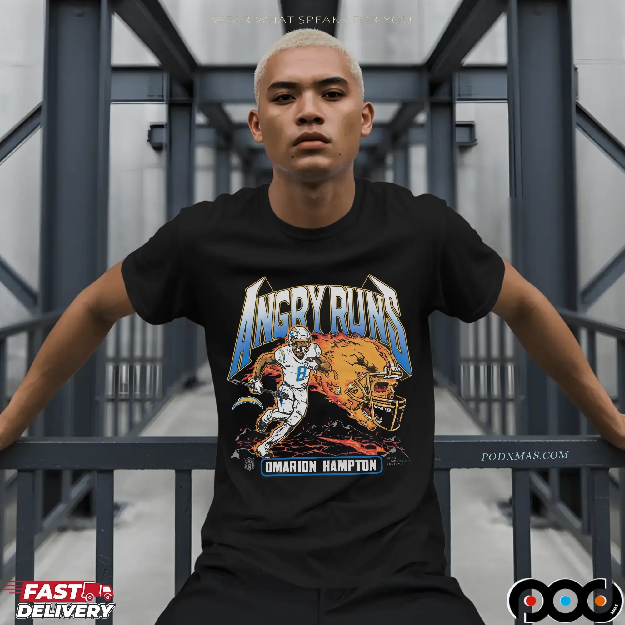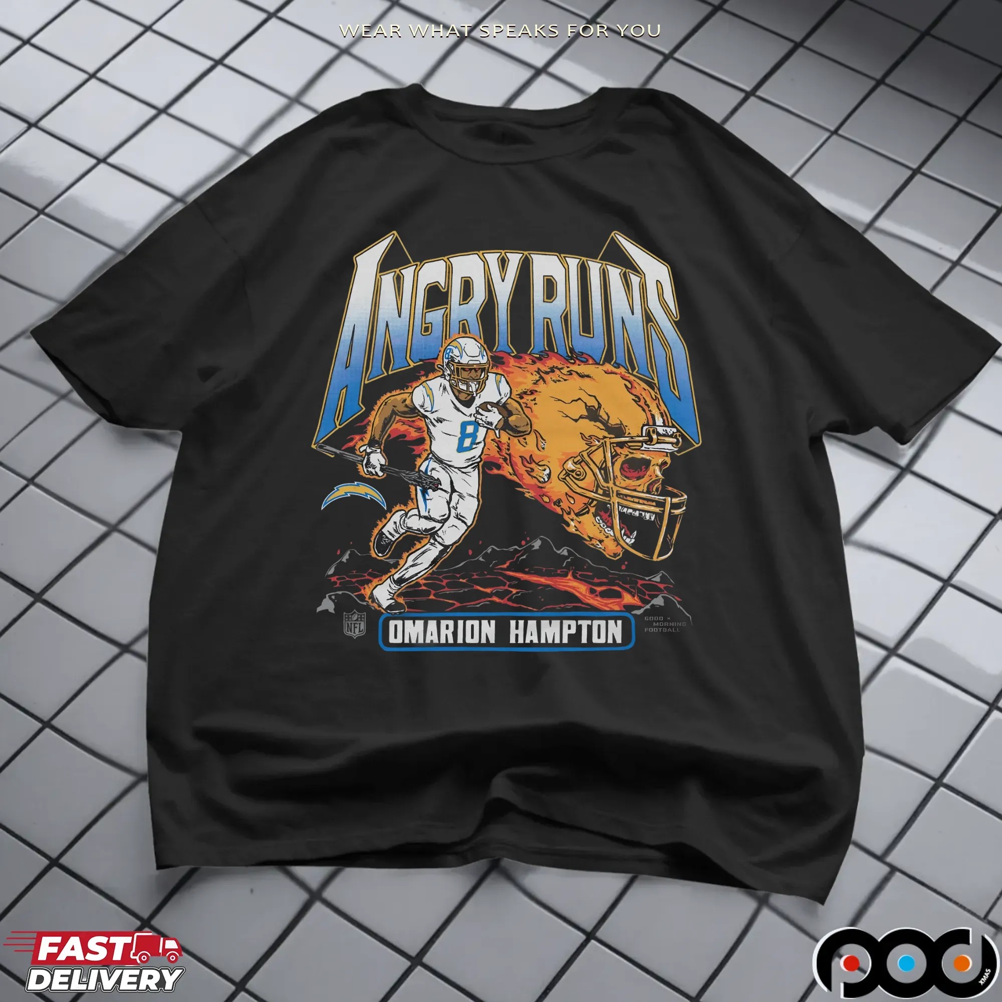 When it comes to quality and selection, the Angry Runs Angeles Chargers Omarion Hampton 2025 T Shirt from podxmas.com stands out from the rest. Our shirts are made from premium materials, ensuring a soft, breathable feel against your skin. We offer a variety of styles beyond just the classic T-shirt, including hoodies, sweatshirts, and tank tops, catering to fans of all ages. Need something for the little ones? We have baby tees and kids’ sizes, so the whole family can join in on the fun! The ordering process is simple, and customization options make it easy to create a unique piece that truly expresses your fandom. With so many options available, podxmas.com is your one-stop-shop for all things Chargers apparel, making it easier than ever to support your team in style.