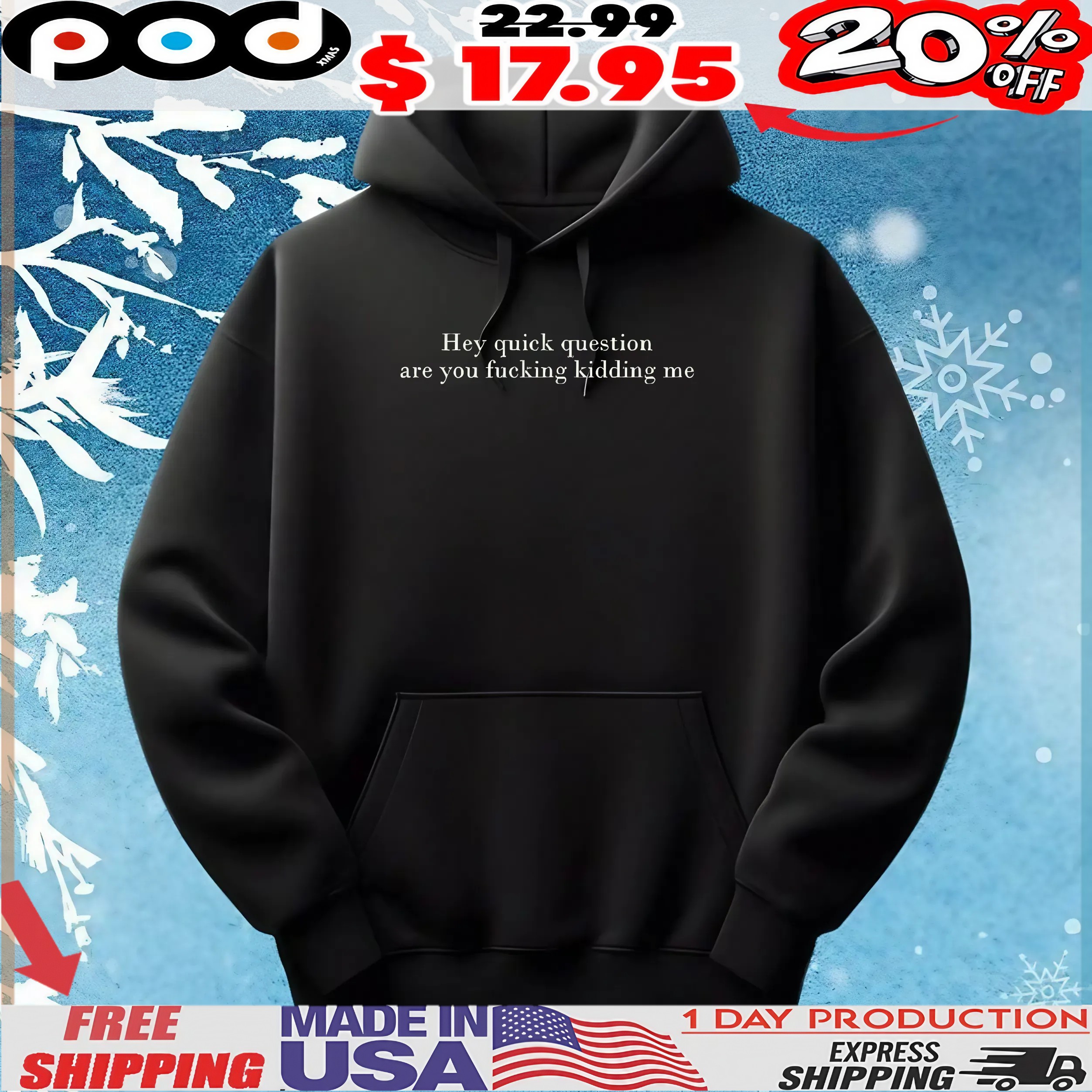 The “Hey Quick Question Are You Fucking Kidding Me T Shirt” is more than just a tee; it’s a reflection of your personality! This shirt has gained popularity as a global trend, resonating with individuals who enjoy cheeky humor and want to make a statement. Crafted from high-quality materials, it offers both comfort and durability, making it suitable for everyday wear. Personalization options are also available—add your own custom text, images, or logos to make it uniquely yours. This level of customization allows you to express yourself in a way that truly stands out from the ordinary. Perfect for gifts, casual outings, or just to flaunt your distinctive style, this t-shirt is a must-have for anyone looking to add a playful twist to their wardrobe.