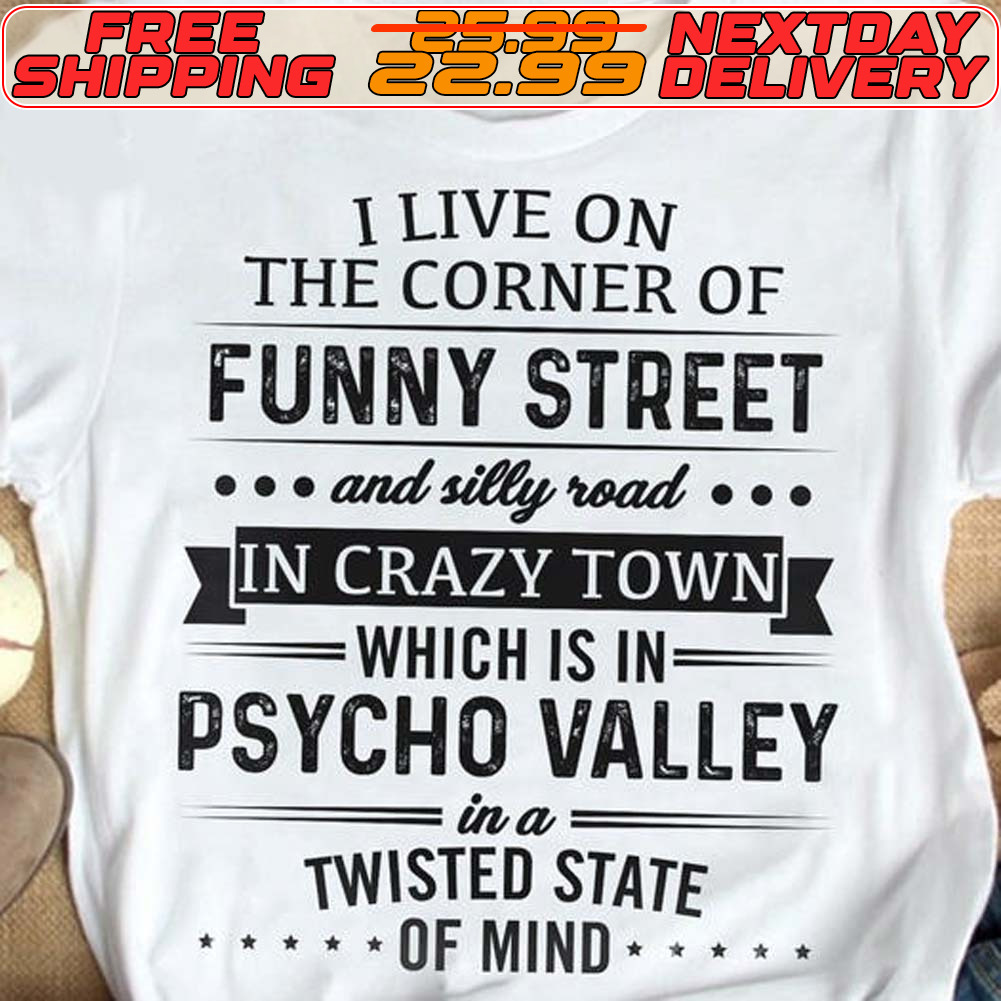 I Live On The Corner Of Funny Street And Silly Road Which Is In Psycho Valley In A Twisted State Of Mind Shirt