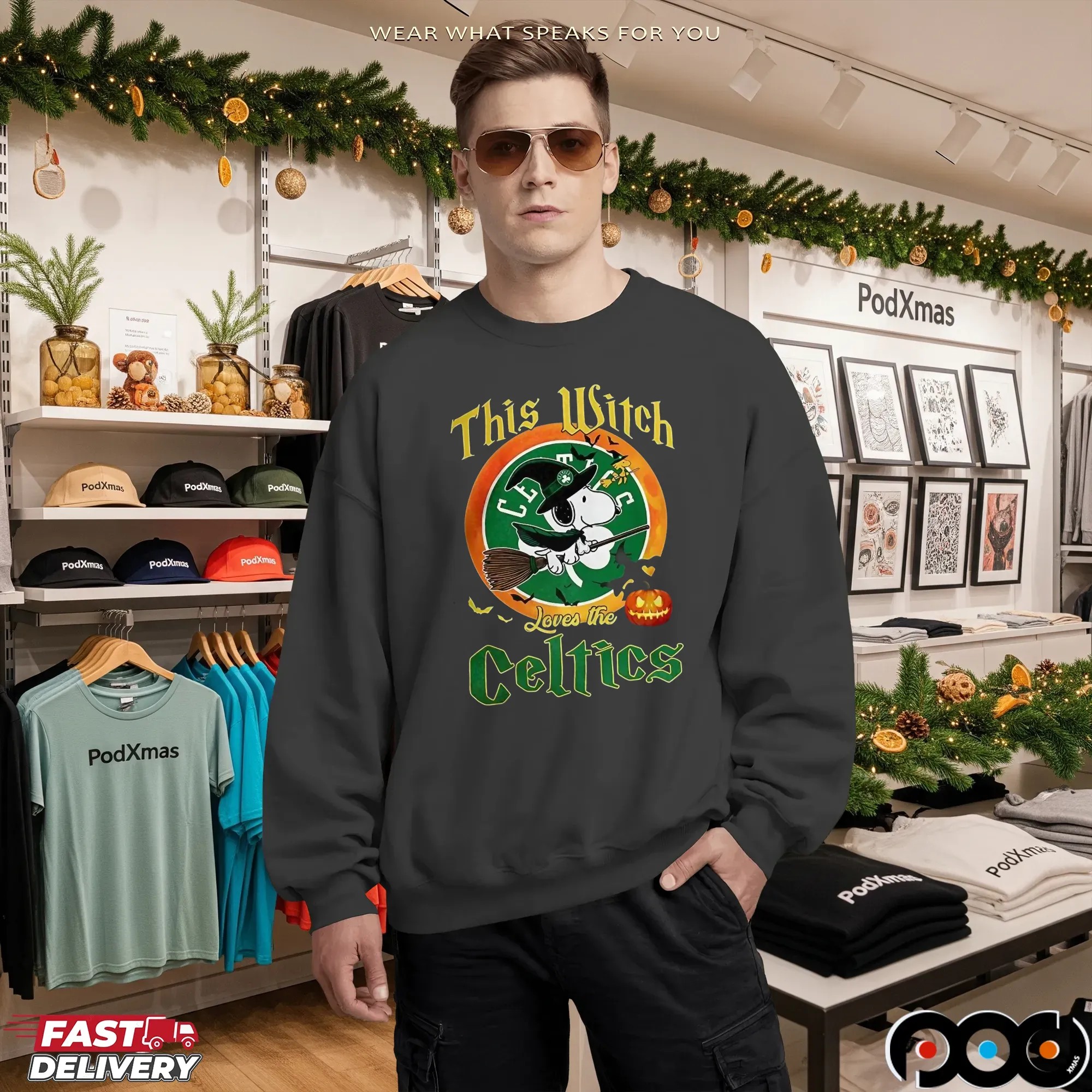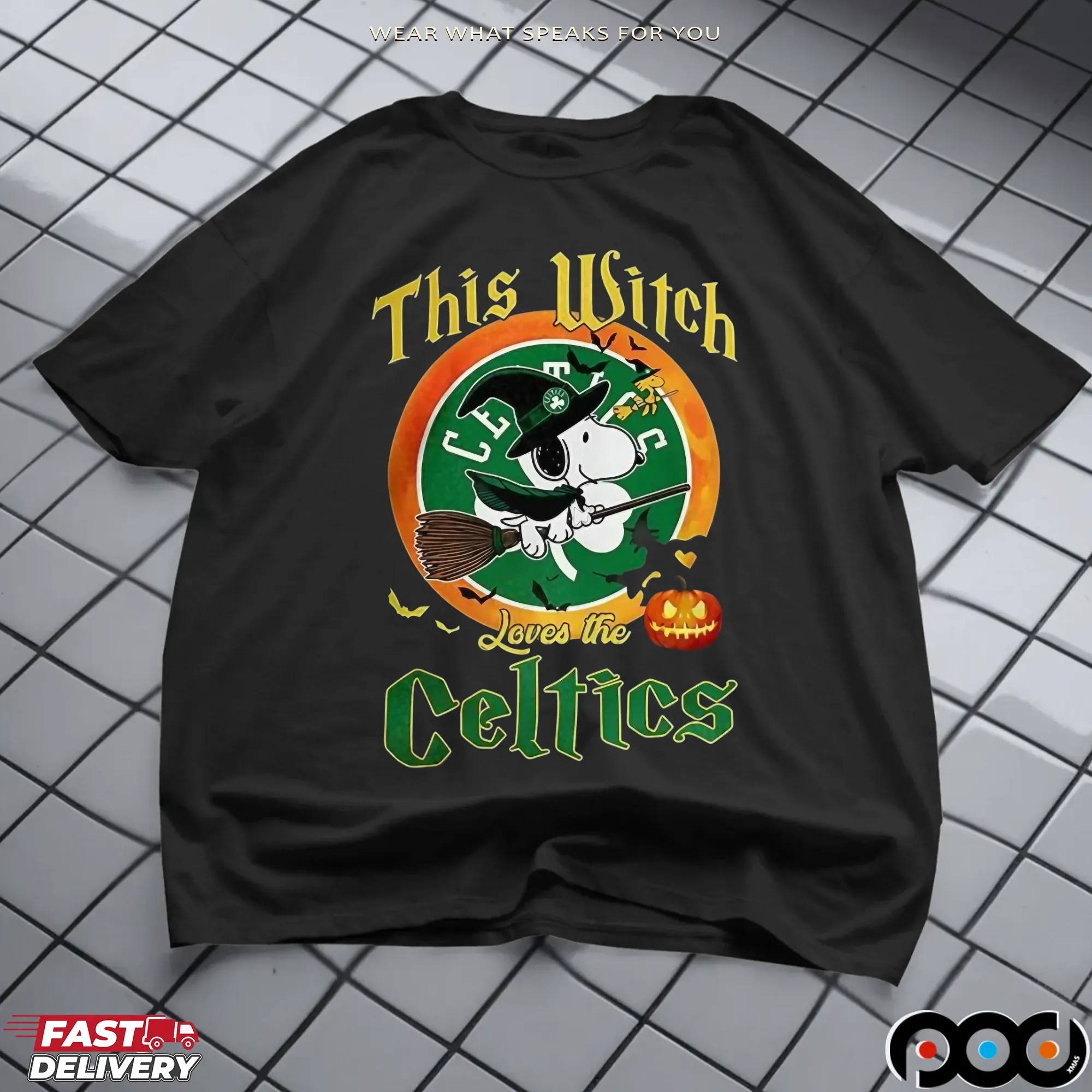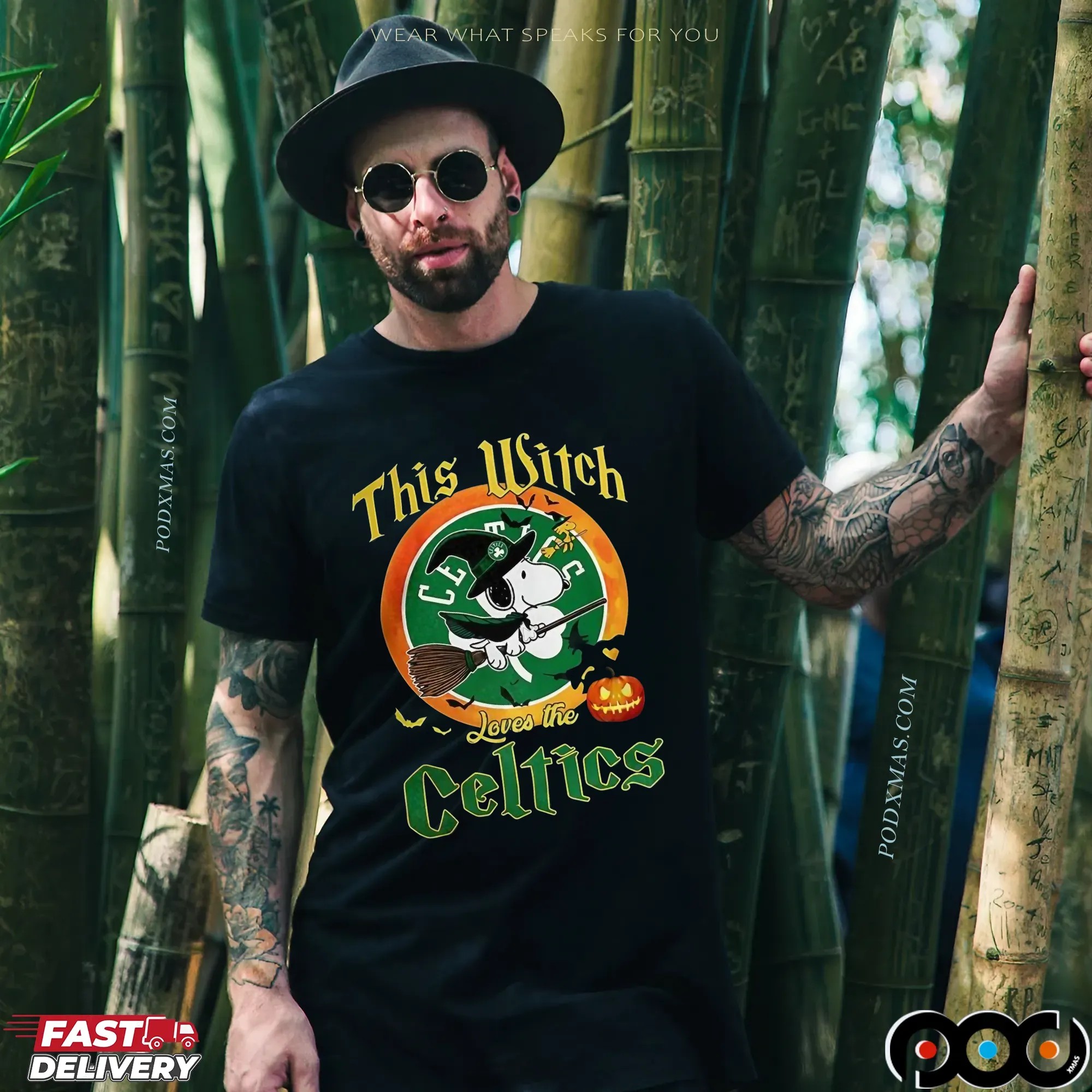 Snoopy This Witch Loves The Boston Celtics Halloween T Shirt , hoodie, sweater, cropped tee, long sleeve, v-neck, youth tee, mug