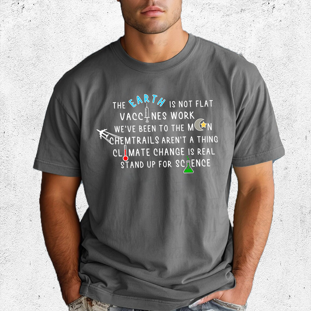Promote Scientific Literacy with the “The Earth Is Not Flat, Vaccines Work, We’ve Been to the Moon, Chemtrails Aren’t a Thing, Climate Change Is Real – Stand Up for Science” Shirt