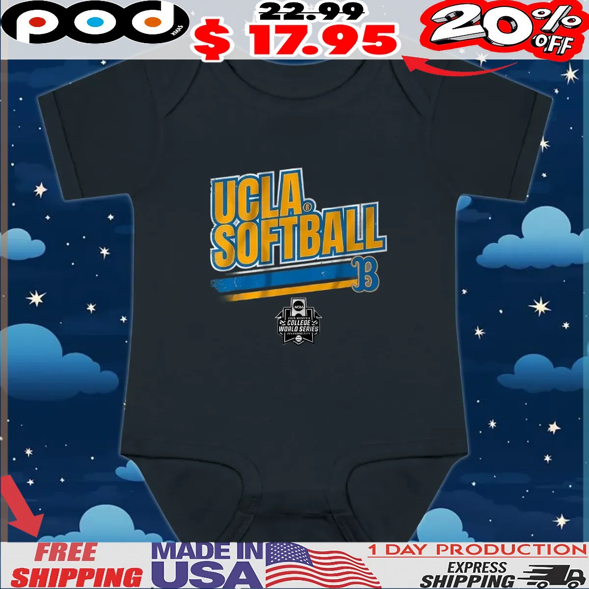 At Podxmas Clothing, we are committed to providing high-quality apparel that resonates with our customers. Our UCLA Softball Women's College World Series Stripe T Shirt reflects our dedication to excellence, ensuring you look and feel your best while supporting your team.