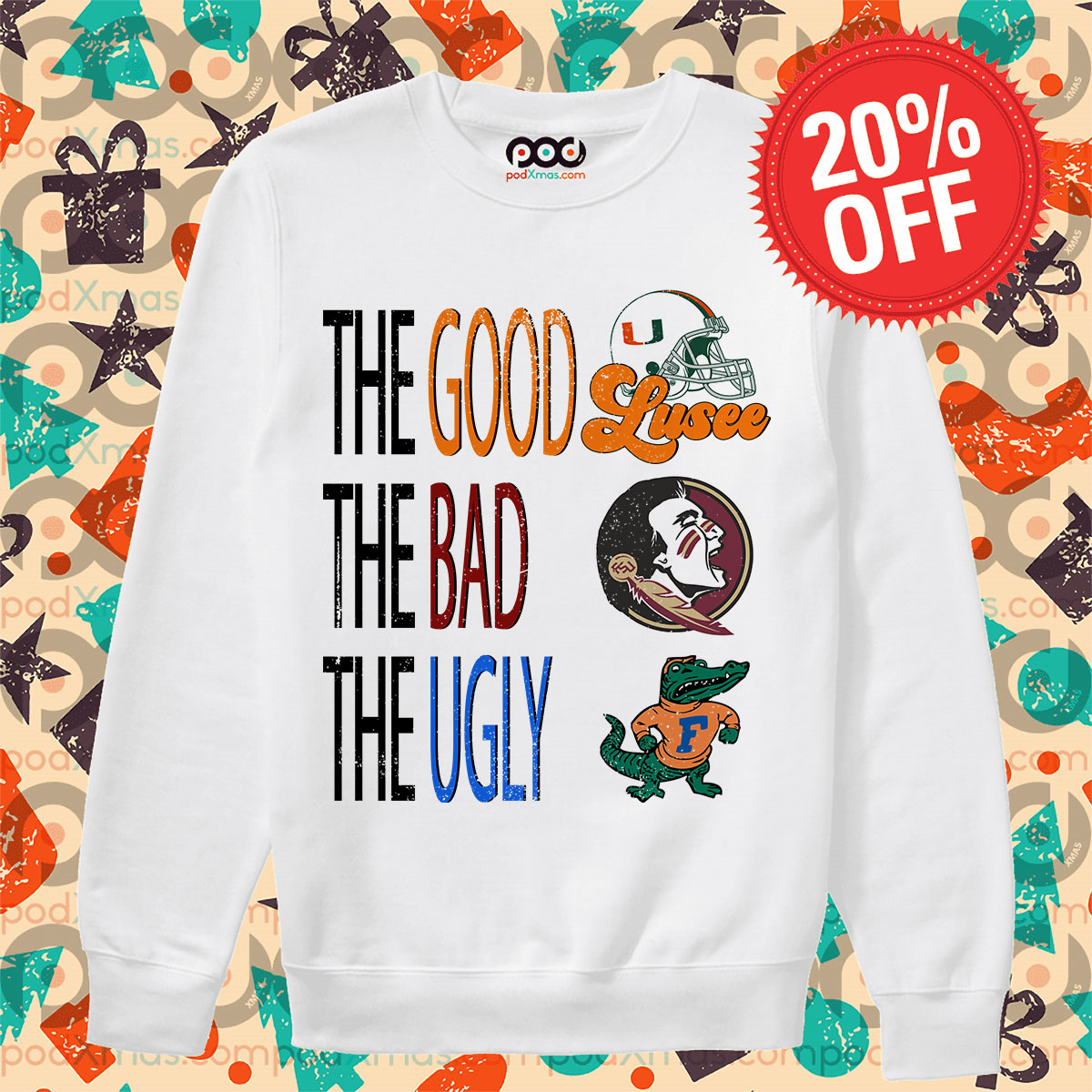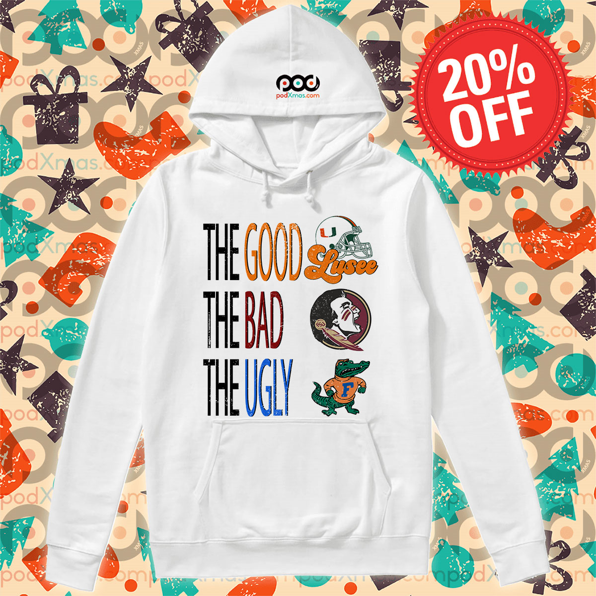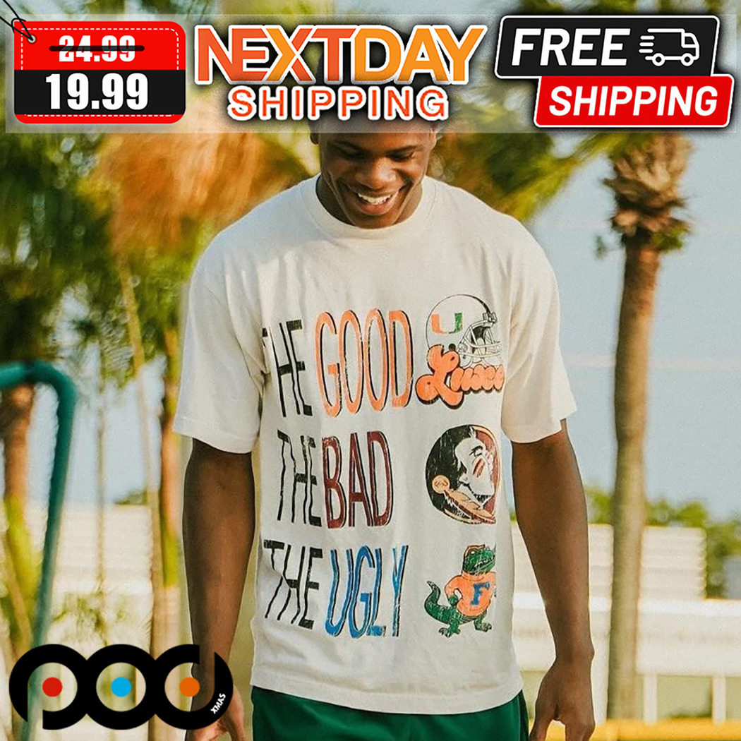 The “Good” honors the team’s many successes and victories; the “Bad” notes the difficult defeats and obstacles; the “Ugly” honors the University Of Miami The Good The Bad The Ugly Shirt fiery and unrelenting spirit that defines Miami sports.Designed on a premium cotton shirt, this pattern is robust and comfy, ideal for tailgating, game attendance, or simply flaunting your school passion throughout town. There are several sizes for the shirt, so every fan—from proud alumni to current students—will find a fantastic fit.